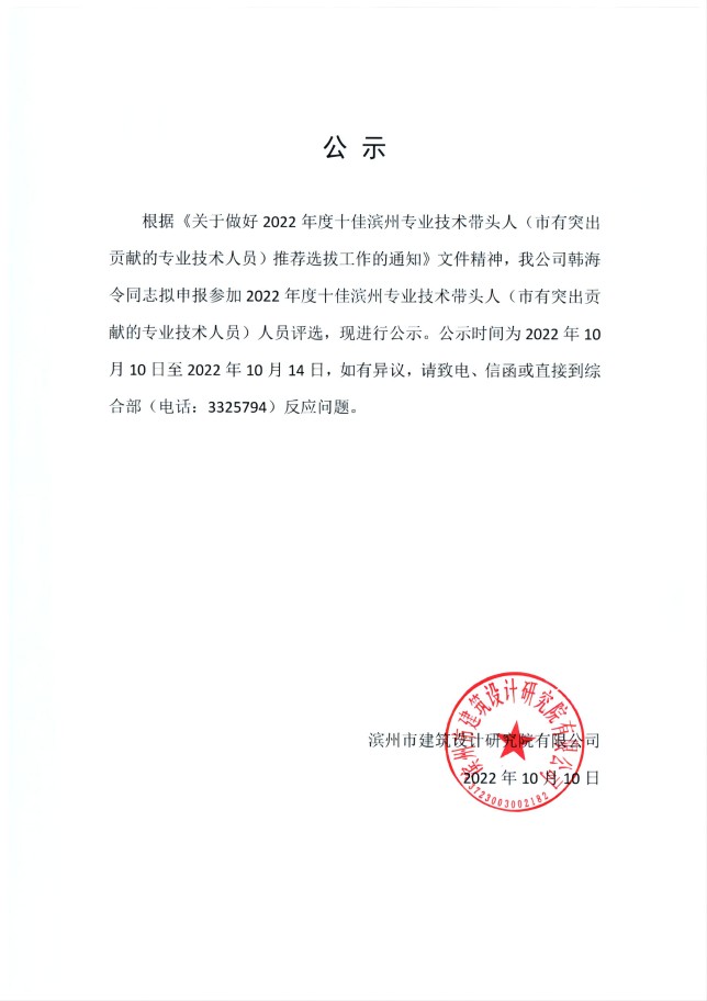 韓海令同志擬申報參加2022年度十佳濱州專業(yè)技術(shù)帶頭人評選的公示